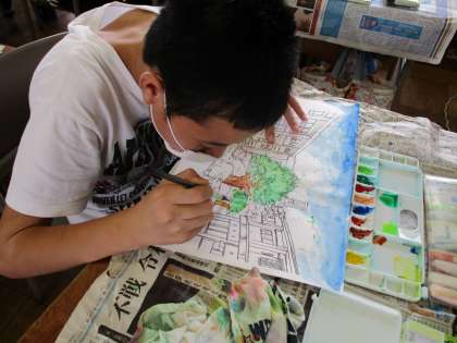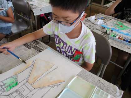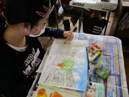 水の量を調節したり、色を混ぜたりして木や校舎の壁などに色を塗ることができました。