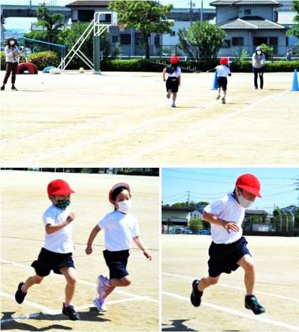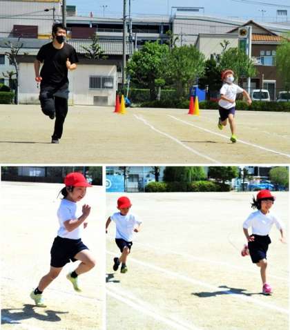 体育の時間に、学年全体で50メートル走の練習をしました。腕を振って、前を向いて、一生懸命に駆け抜けることができました。