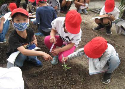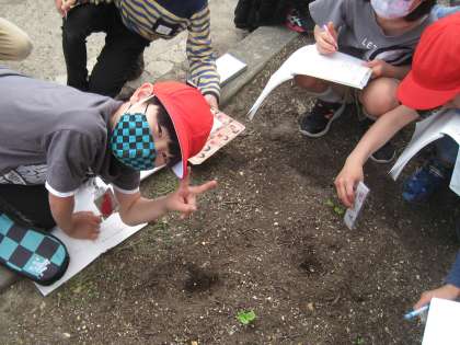 児童らは、触ったり、色や形、大きさを比べたりしながら観察したことをノートにまとめました。