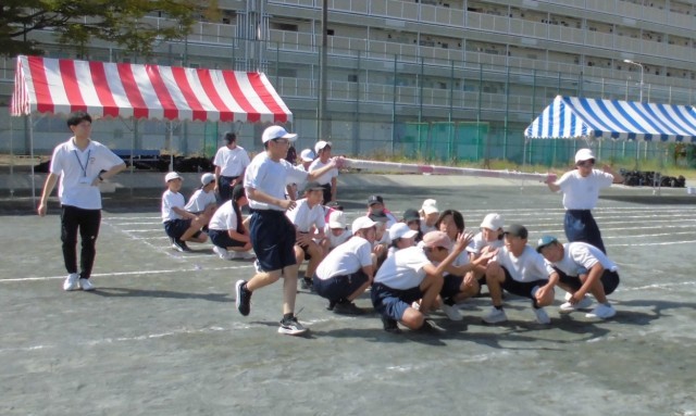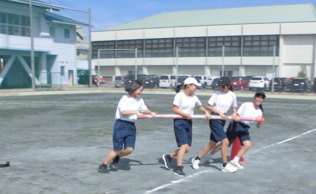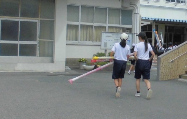 今日は学年競遊の練習をしました。棒を持って走るのはどのクラスもとても上手になってきました。勝敗を分けるとすると、クラス全員が棒をいかにスムーズに跳び、次のグループに渡すかだろうと思いました。本番ではどのクラスも頑張ってほしいと思います。この練習の後片付けで、とてもうれしい場面を目にしました。自主的に片づけをしてくれる生徒がたくさんいたことと、先生が器具庫に何本か棒を持って運んでいると、駆け寄って「先生、運びます」といって運んでくれる場面を目にしたことです。一つの行事を通して生徒の心が育っているのを感じ、とてもうれしく思いました。