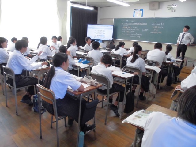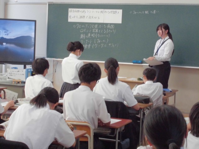 1年の2つのクラスで教育実習の先生の授業の様子を写してみました。それぞれ技術と社会の授業を行っていました。みんな一生懸命に考えて授業に参加していました。教育実習の先生たちは、それぞれ今日または月曜日が最終日だそうです。3週間お疲れさまでした。