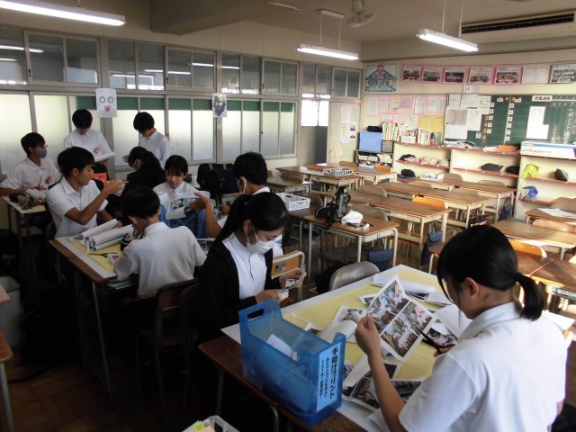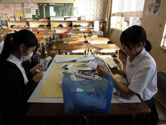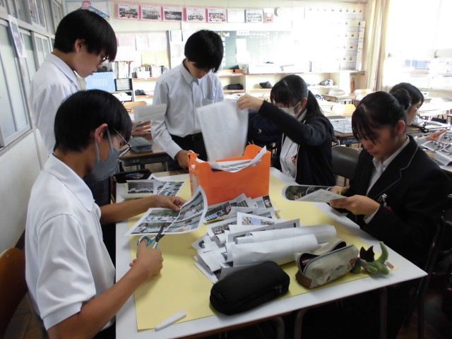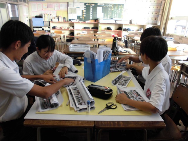 3年生の体育祭の掲示物作成の様子です。実行委員の生徒たちが、ダンス、学年競技、リレーや開会式などに分かれて掲示物を作成し始めました。体育祭の思い出が思い出されるようで、生徒たちは楽しそうに写真を選んでいました。