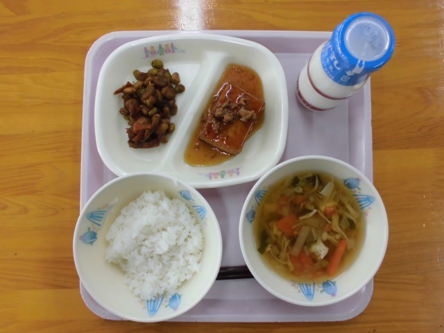大豆は姿を変え、いろいろな食品になります。今日の絹厚揚げのそぼろあんかけに使われている絹厚揚げやしょうゆ、鉄火みその赤みそやえだまめ、湯葉のすまし汁の豆腐や湯葉も大豆から作られています。大豆製品は和食に欠かせない食品と言えます。