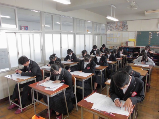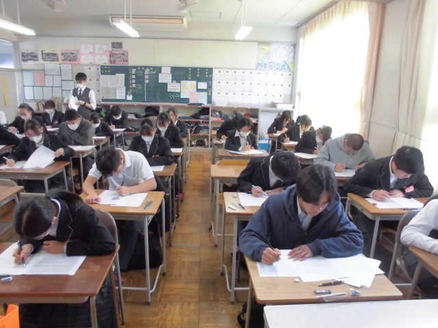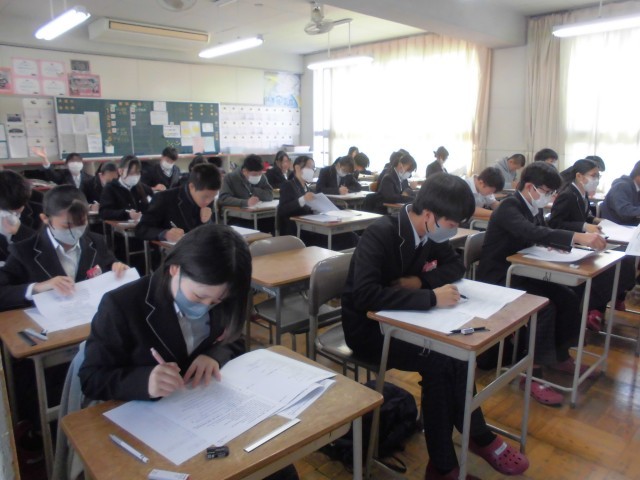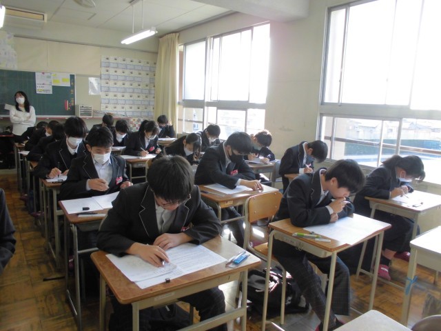 3年生の5科テスト1日目の様子です。これまで学習した内容全てが範囲になっているテスト、多くの生徒が時間いっぱい最後までテストに取り組んでいました。