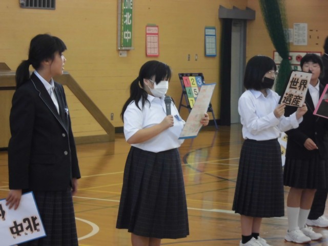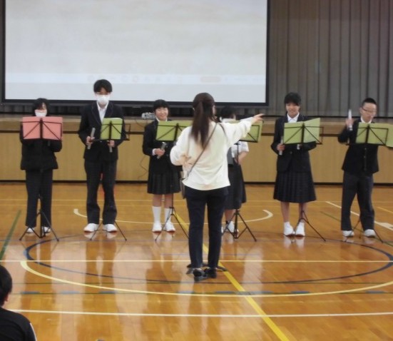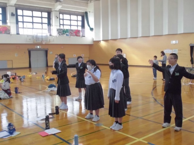 宮西小・貴船小・富士小のお友達を招いて小中交流会を行いました。自己紹介をした後、ダンスや合奏などの発表を行いました。北部中学校は、トーンチャイムの演奏を行いました。また、中学生が考えたゲームを通じて、小学生と交流をして楽しい時間を過ごしました。