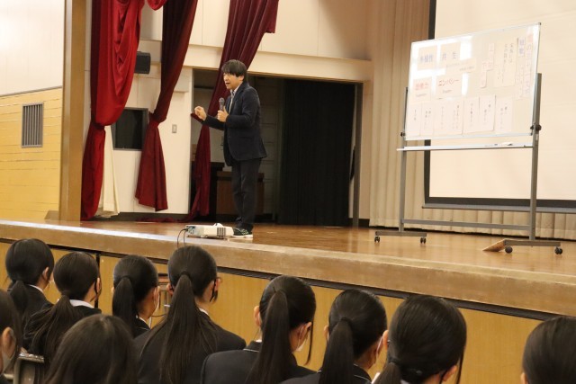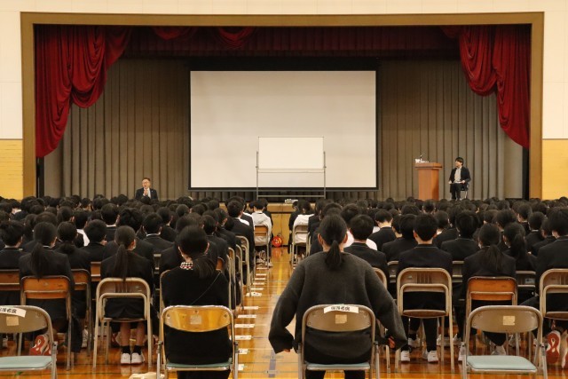 今日は各学年ともにテストが終わり、午後から文化講演会を聞きました。『「多様性」を認め合う社会を「共にいきる」ために!』という演題で話を聞きました。とても話がおもしろく生徒も身を乗り出して話を聞いていました。心に残る話だったと思います。