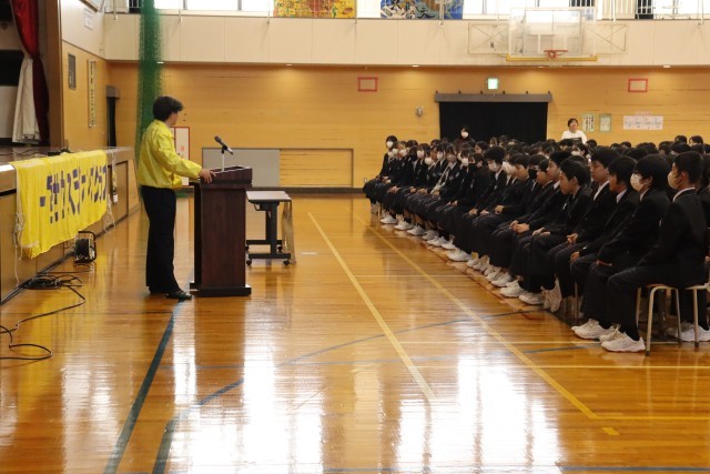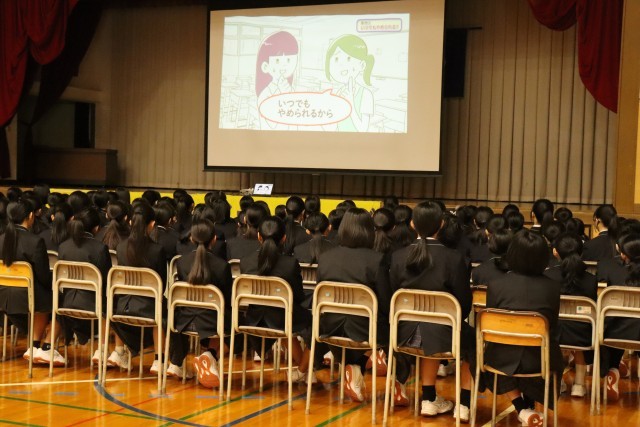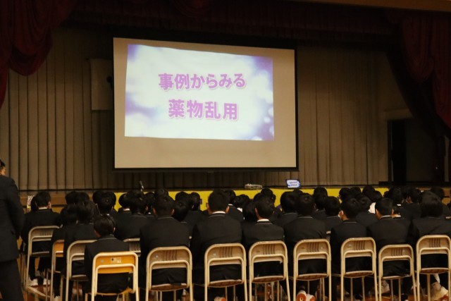 今日は、サウズライオンズクラブの方から違法薬物についてのお話を聞きました。「1回ぐらい…」「すぐやめられるから」などの甘い考えは絶対にダメ。1回でも違法は、違法。すぐにやめられないから。もし誘われても、絶対に断ろう。