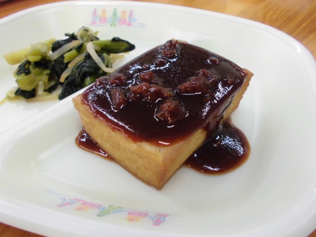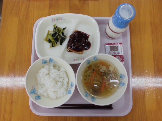 今日は「正しいはしづかいの日」です。はしにはたくさんの使い方があります。絹厚揚げを「切る」、こまつなのおひたしを「はさむ」、みぞれ汁の具を「すくう」、それらを口に「運ぶ」など、正しいはしづかいを意識して食べましょう。