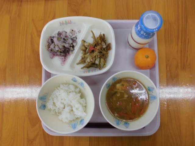 今日は「旬を味わう日」です。一年の中で野菜や果物、魚などがたくさんとれ、栄養が多く、おいしい時期を「旬」と言います。今日の旬の食材は、「わかさぎ、れんこん、はくさい、かぶ、みかん」です。かぶは、寒さが続く今が一番おいしい時期です。火を通すと柔らかくなり甘味と旨味が増します。