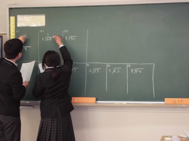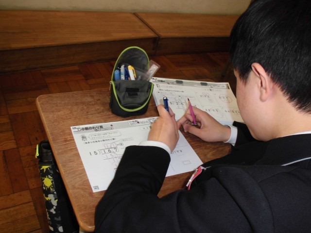 割り算の筆算の学習に取り組みました。小数の計算では、小数点の位置にも気をつけなければなりません。色々な問題に挑戦して実力をつけようと頑張りました。