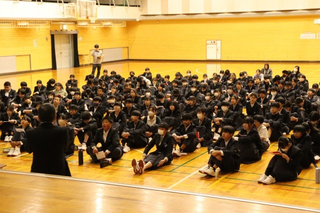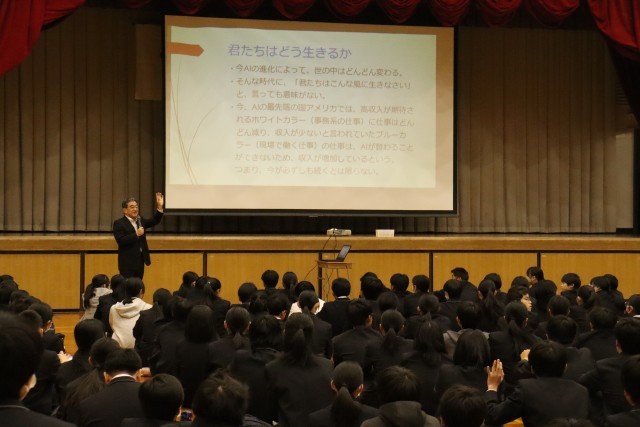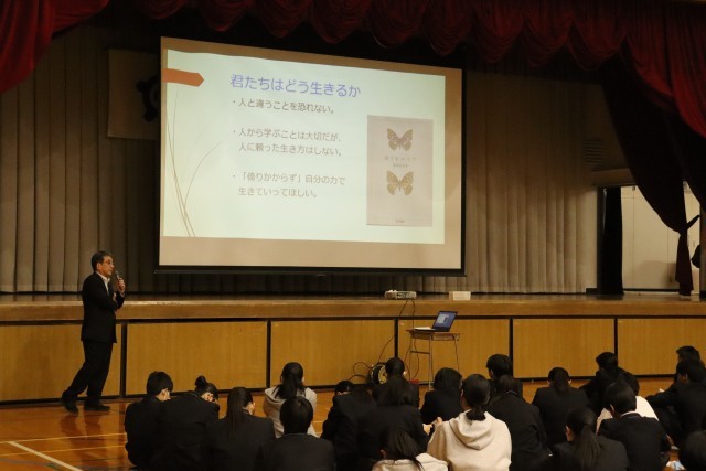 今日は「君たちはどう生きるか」というテーマで、1年生全員が話を聞きました。話をしてくれた先生の生き様や学びを通して生徒が何かを感じ、これからの将来の選択に生かしてくれたらと思います。