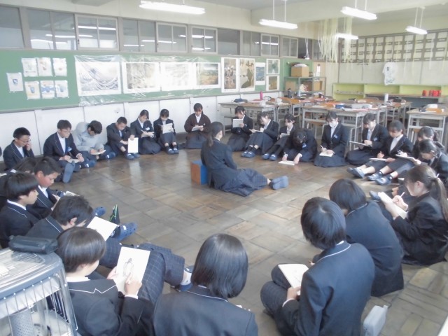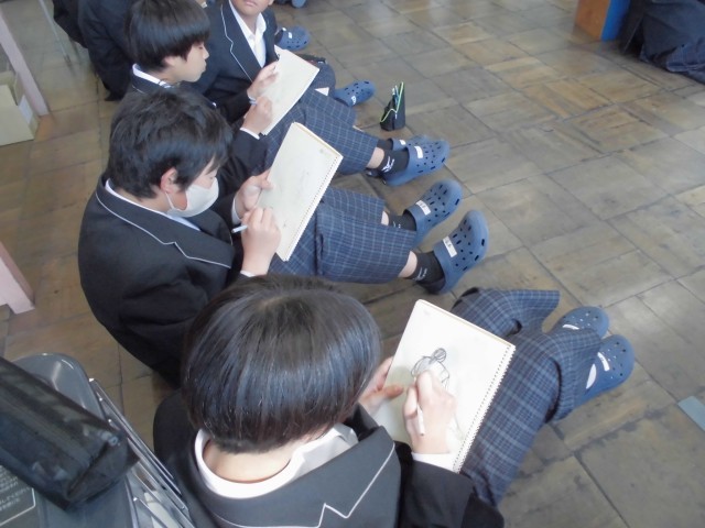 美術の授業の様子です。本日は、人物の大まかな形をとらえ、素早く描くクロッキーを行いました。3分間と短い時間でしたが、どの生徒も真剣な眼差しでモデルを見つめ、描くことができました。