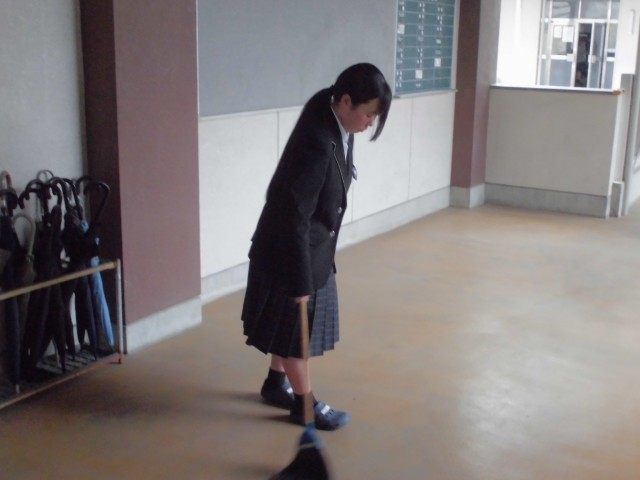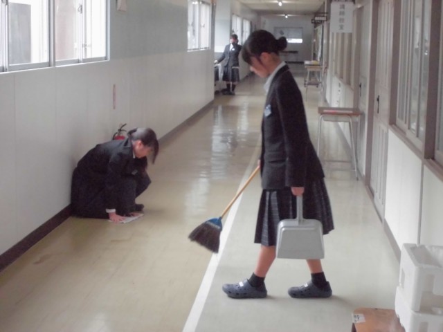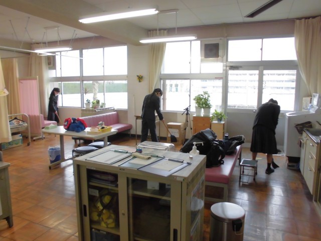 清掃活動の様子です。保健室と廊下、渡りの3年生が行っていた場所の掃除を、1年生が行っています。