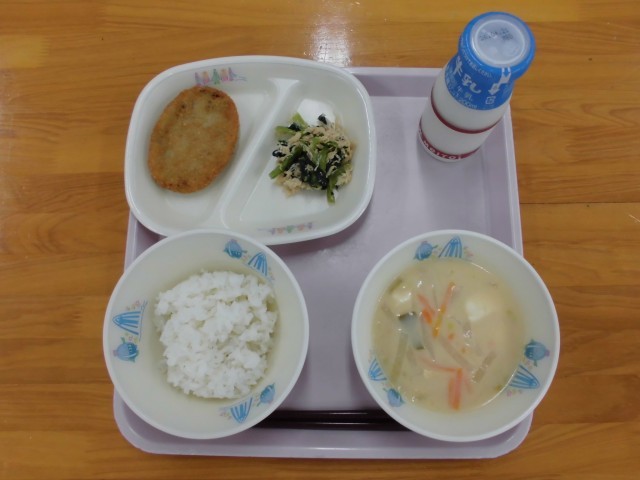 今日の給食の「豆乳入りみそ汁」には、白みそや豆乳など、大豆から作られた食べ物が使われています。豆乳は大豆を水に漬けてからすりつぶし、水を加えて煮た汁を布でこしたものです。大豆は畑で栽培される作物の中でも、体をつくるもとになるたんぱく質が豊富に含まれており、「畑の肉」と言われています。