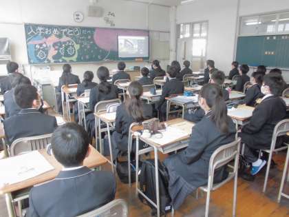 『1年生には、北中スローガンにについての話です。本校のスローガンは「WE LOVE 北中」です。平成8年度から20年以上続いている伝統のスローガンです。サブタイトルは、「自分らしく 人のために行動する」