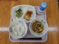 今日の献立は、ご飯、牛乳、マーボーはるさめ、ポークシューマイです。マーボーといえば真っ先にマーボー豆腐が思い浮かぶかもしれませんが、今日はマーボーはるさめです。はるさめの他には豚ひき肉、たまねぎ、にんじん、長ねぎ、にらが入っています。マーボーは辛いイメージがあるかもしれませんが、今日の給食ではトマトケチャップを使い、食べやすい味に仕上げました。