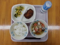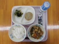 今日の献立は、ご飯、牛乳、根菜カレー、フルーツクリームヨーグルトです。根菜とは、土の中で成長する根や茎を食べる野菜のことです。今日の「根菜カレー」には、れんこん、ごぼう、だいこん、にんじんといった根菜が入っています。同じ根菜類でも食べる部分が違い、 れんこん は茎 の部分、ごぼう、だいこん、にんじんは根の部分を食べています。