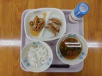 今日の献立は、ご飯、牛乳、はまちの照り焼き、いんげんのごま和え、呉汁、です。