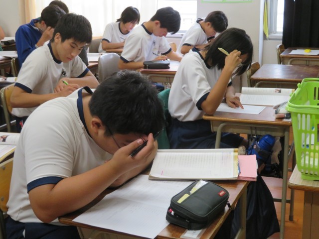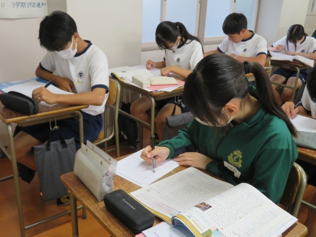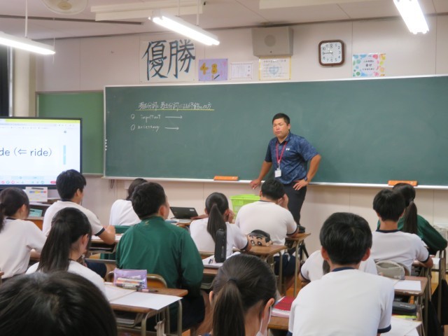3年生の英語の授業のようすです。「How con we help each other in a disaster?」のテーマで書かれた英語のレポートを読み取って問題に挑戦していました、
