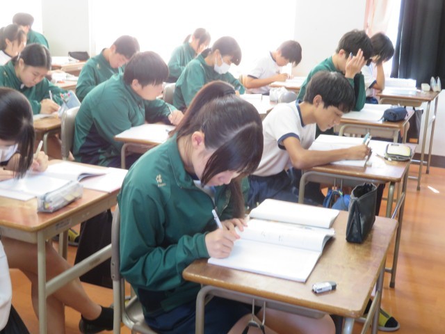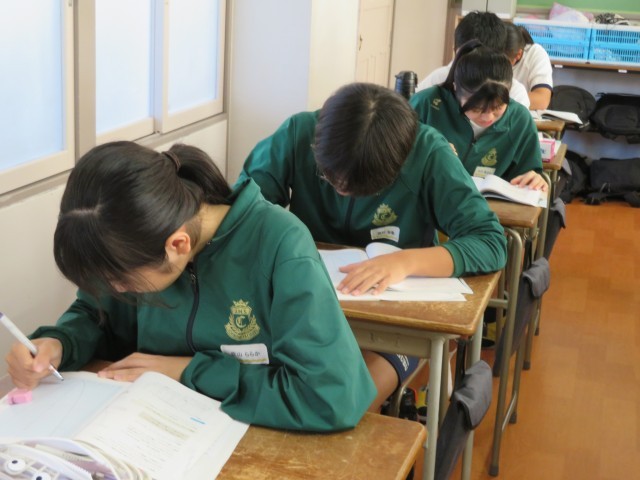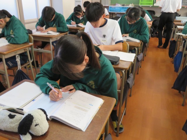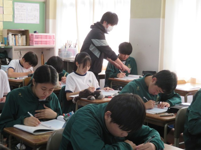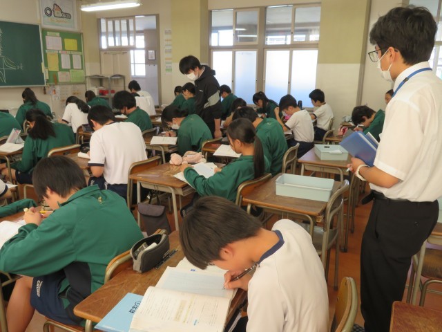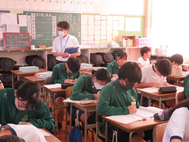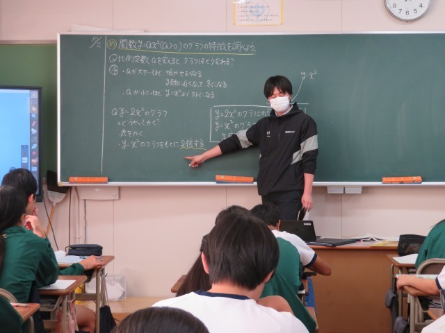 3年生の数学の授業のようすです。yがxの弐乗に比例する関係について、グラフでどのように表せるか考えました。比例定数によって、グラフの形がどのように変わっていくか特徴をつかむことができましたね。