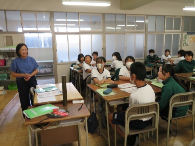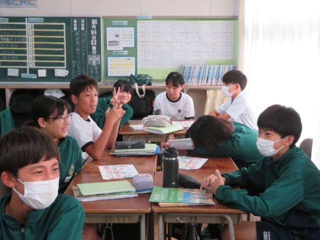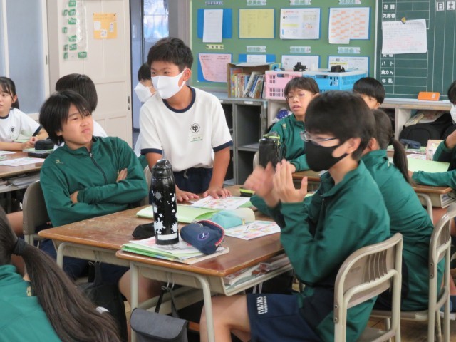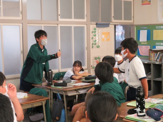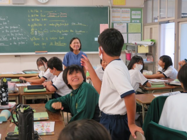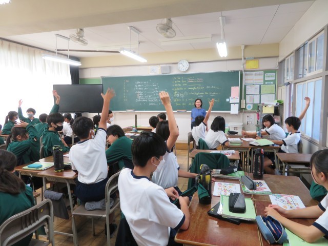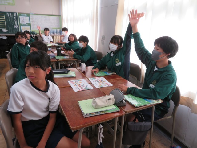 1年生の英語の授業のようすです。「who」「what」「where」などを使った問題をALTの先生に出題してもらってクイズのように答えながら英語を楽しんでいました。
