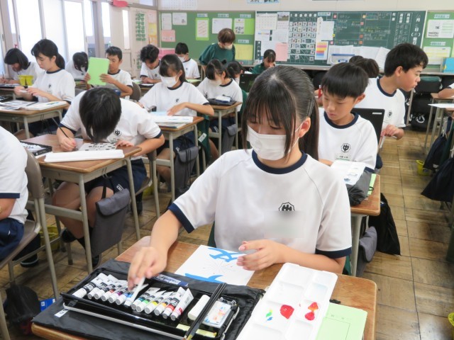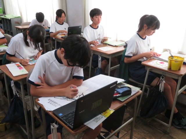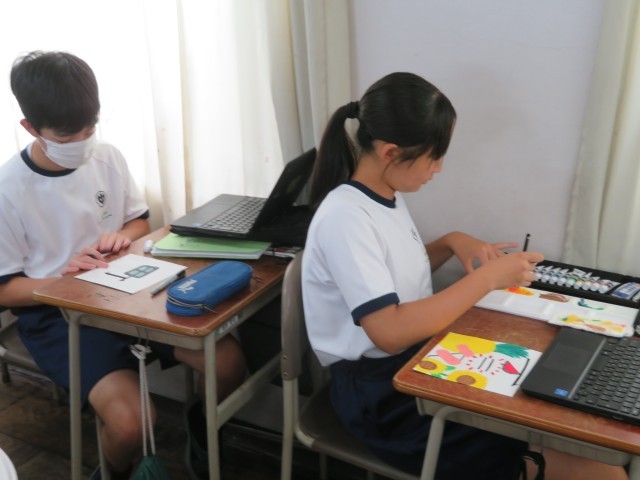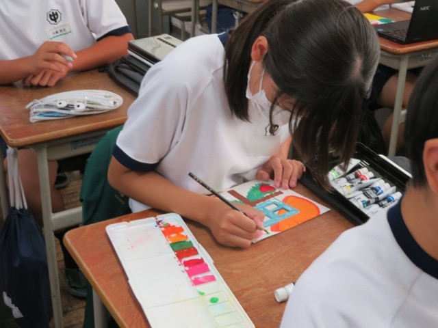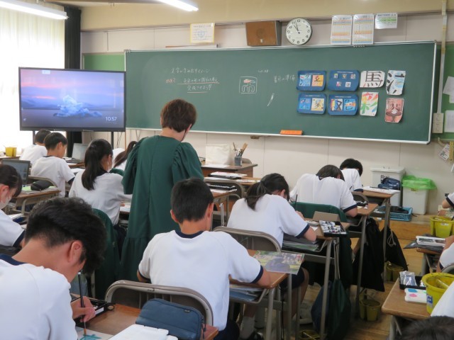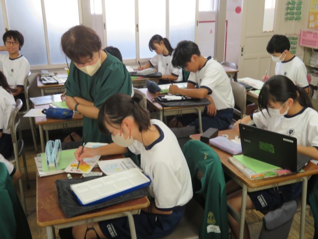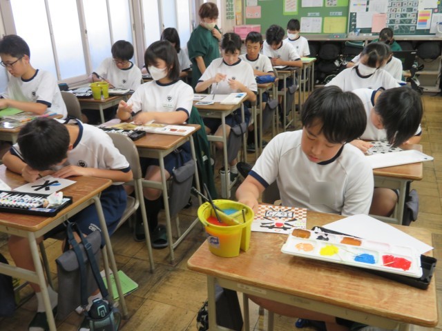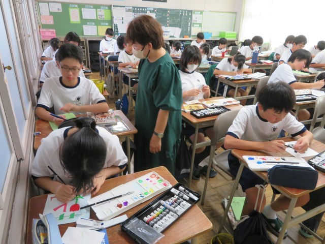 1年生の美術の授業のようすです。「色彩や形の調和を考えて完成させよう」というめあてで、文字が生み出すイメージの作品づくりに取り組んでいました。