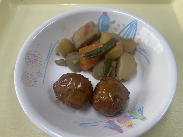 今日の給食のメニューは、ご飯、牛乳、愛知県産食材入り肉団子、さといもと栗のうま煮、十五夜汁、月見団子でした。