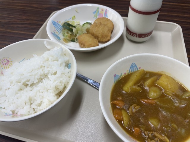 今日の給食のメニューは、ご飯、牛乳、ポークカレー、チキンナゲット、福神漬け和えでした。