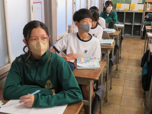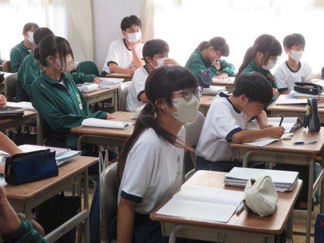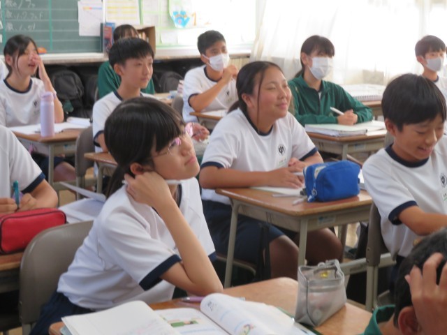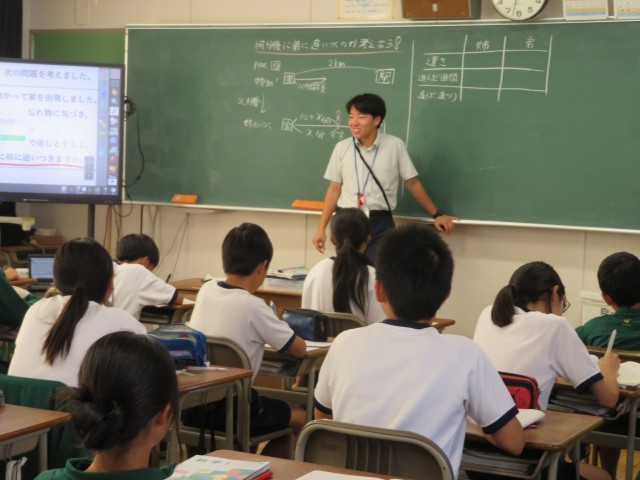 1年生の数学の授業のようすです。「何分後に弟が追いつくか考えよう」というめあてで学習を進めていました。速さ・道のり・時間の関係を表や線分図に整理して、考えを深めていきました。