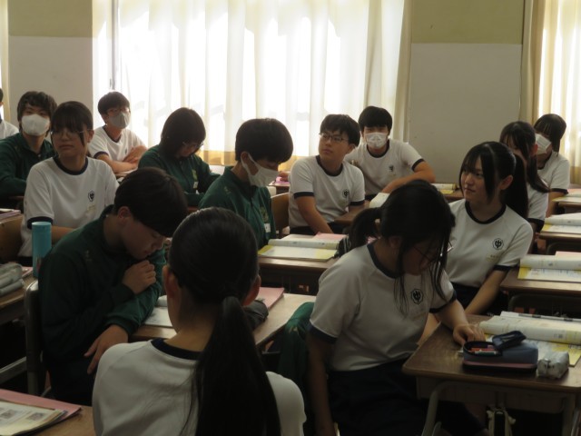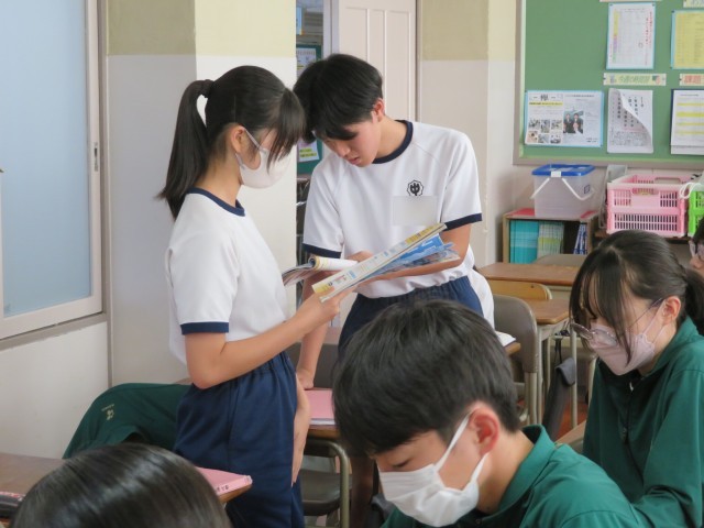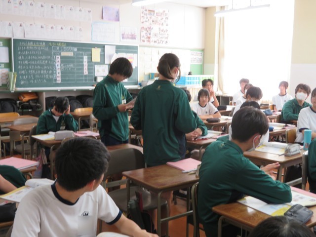 3年生の英語の授業のようすです。「相手の立場に立って、具体的な提案をしながら申し出たり応じたりすることができるようになろう」というめあてで学習を進めていました。困っている人にどんな表現でアプローチするとよいか考えることができましたね。