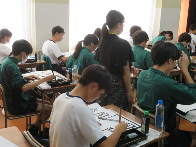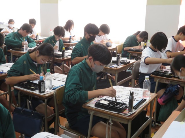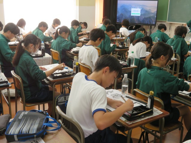 3年生の国語の授業のようすです。「国際交流」の文字をお手本の特徴を表現できるように、集中して筆を運んでいました。