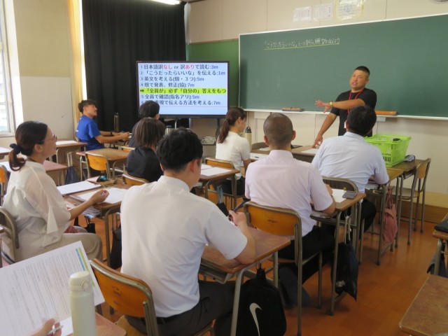 10月29日(木)に校内現職教育で進めてきた授業法のまとめの研究授業を3年生の英語で行います。市内の英語科の先生も参観し、「深い学び」の実現をめざした授業づくり、指導の在り方について研究協議を行います。今日は、生徒のみなさんが下校した後、3年生の教室に先生たちが集まってシミュレーション授業を行いました。今日出された意見やアイディアを基に、さらに生徒が活躍する授業になるように準備を進めていきたいと思います。
