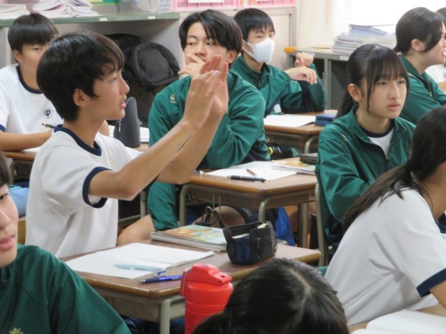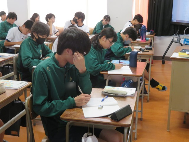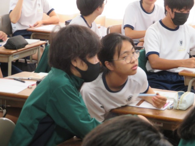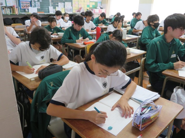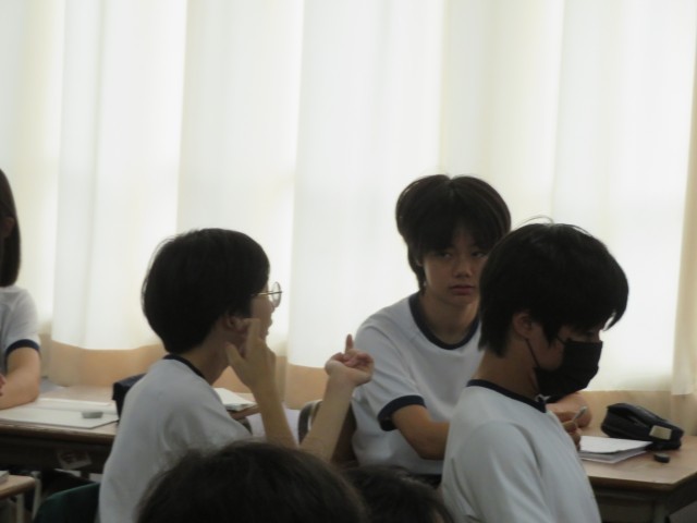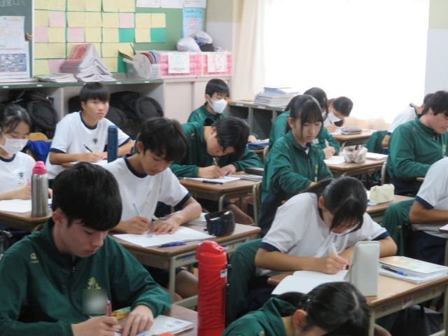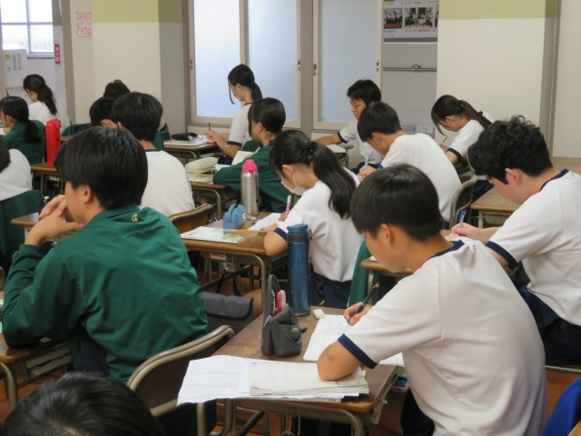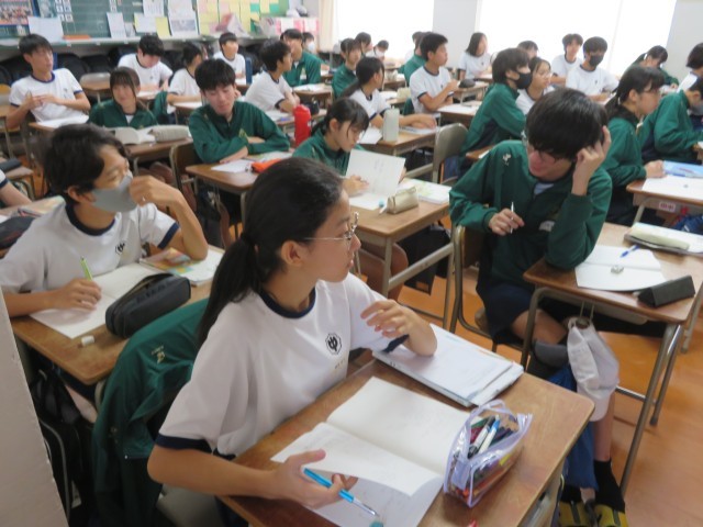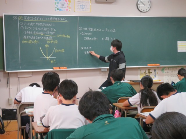 3年生の数学の授業のようすです。yがxの2乗に比例する関数のグラフについて、比例定数の値によってどのような特徴があるのか、みんなで話し合いながら確認し、まとめていました。しっかりと説明できるようになりましたね。