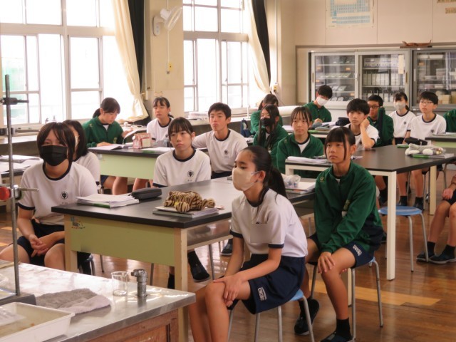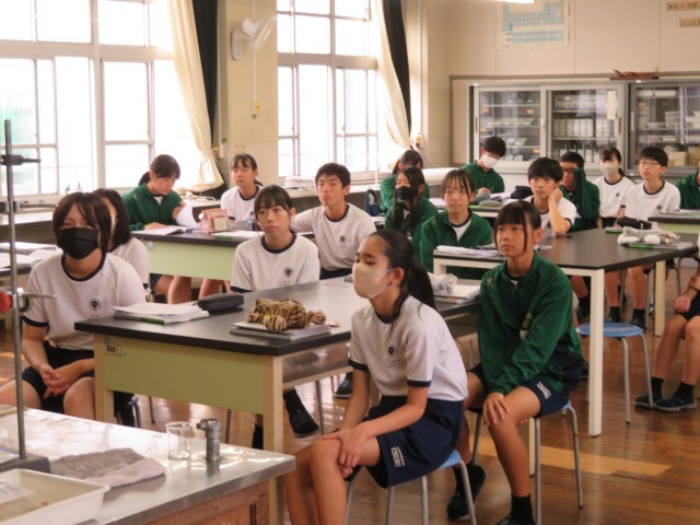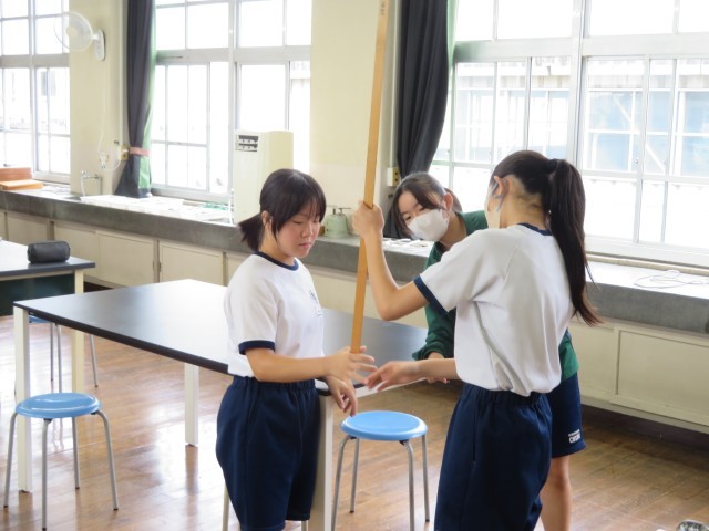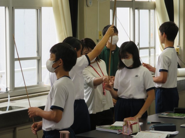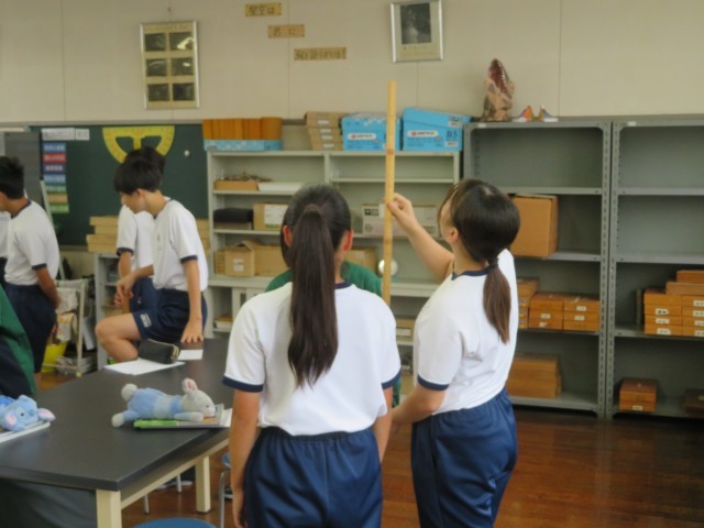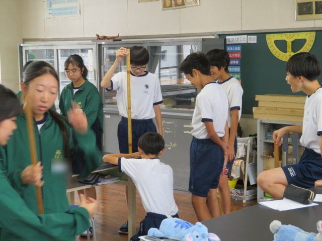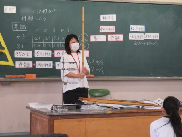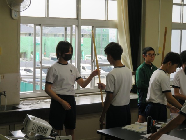 2年生の理科の授業のようすです。「反応とは何か体験しよう」というめあてで学習を進めていました。1m物差しを使って、落ちるのを感じてぎゅっと握る反応するのに、どのくらい物差しが落下したか記録します。さて、みんなの反応の記録はどうだったかな?