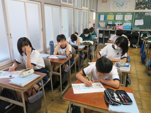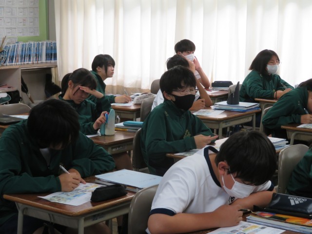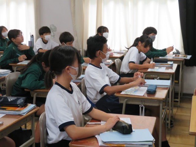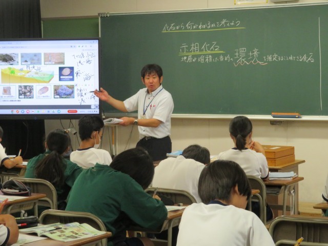 1年生の理科の授業のようすです。「化石から何がわかるか考えよう」というめあてで学習を進めていました。化石は、それが見つかった地層の時代や環境を知るための重要な手がかりになります。示準化石と示相化石という言葉を学びました。どんな違いがあるか説明できるかな。