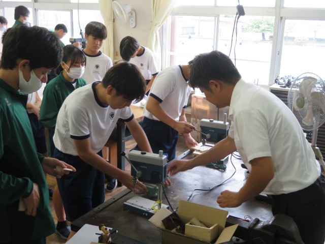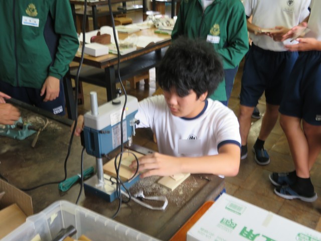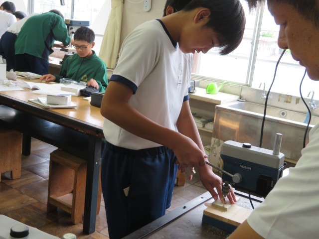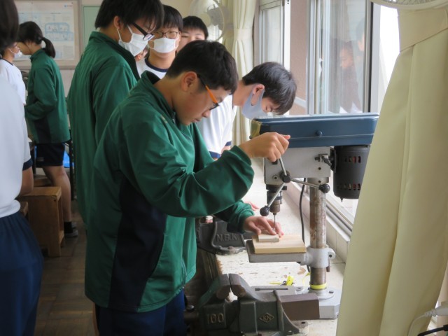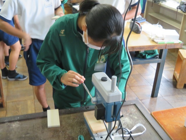 2年生の技術の授業のようすです。オルゴールの製作に取り組んでいました。今日の活動内容は、1右縦側板の穴あけ、2左縦側板の穴あけ、3ピアノ座版と人形座版の穴あけ、イス座版の穴あけです。機会を使って丁寧に作業を進めることができましたね。