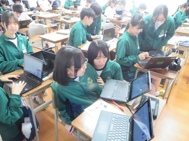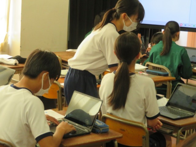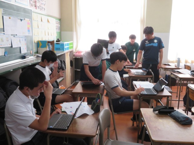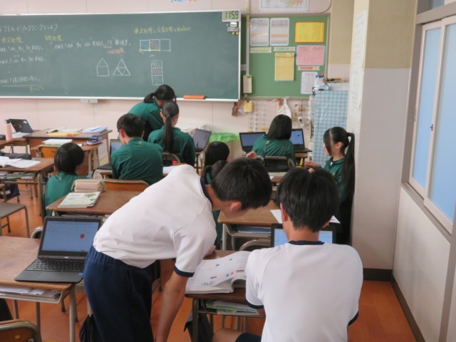 3年生の技術の授業のようすです。「ドリトルでプログラミングをしよう」というめあてで学習を進めていました。「ドリトル」は、プログラミング学習のために開発された日本語のプログラミング言語のことを指し、コンピュータの仕組みやプログラミングの基礎を学ぶために利用されています。うまくプログラムを組んで、友だちと意見交流することができましたね。