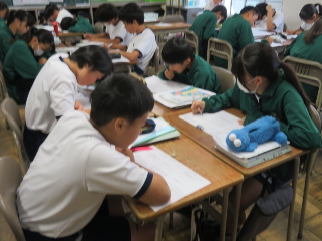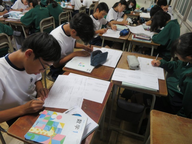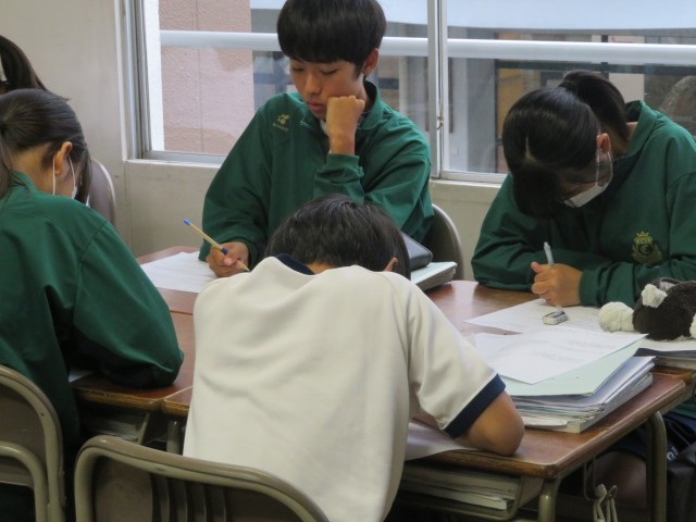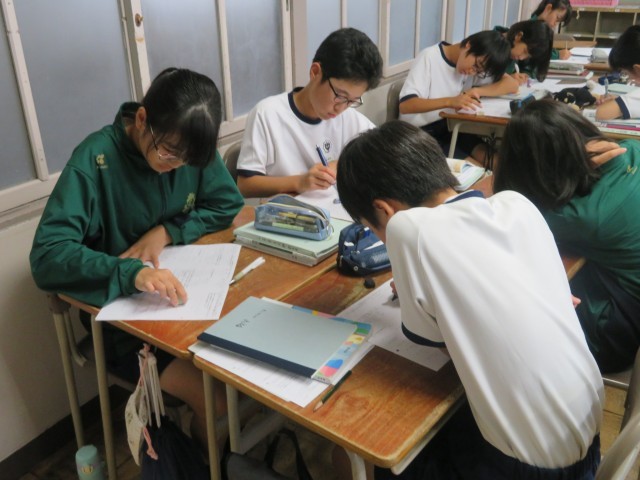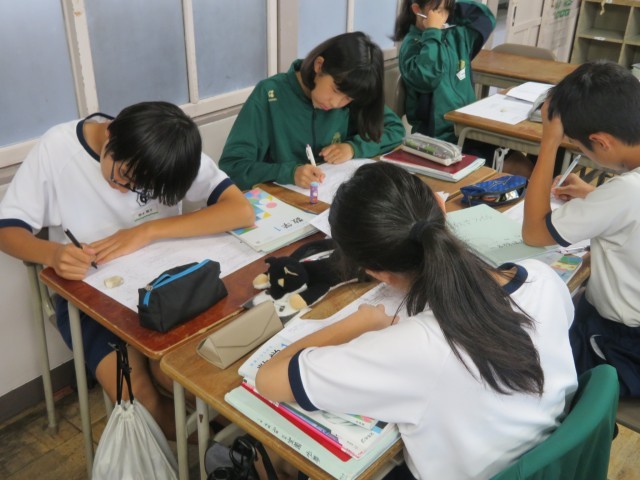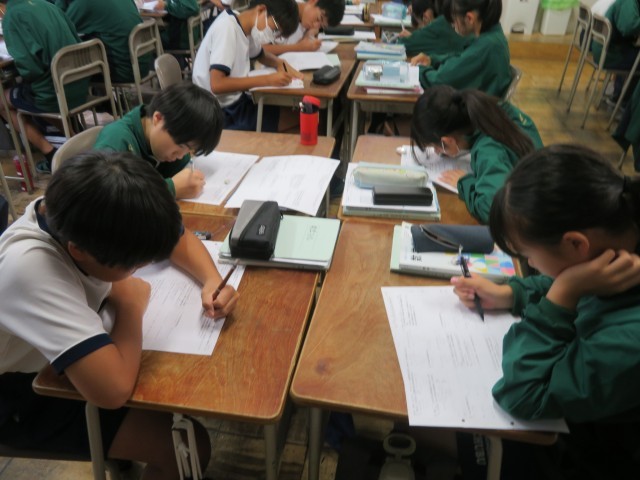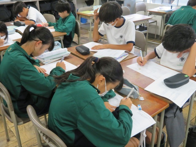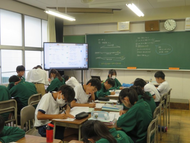 1年生の数学の授業のようすです。方程式に関する問題演習に取り組んでいました。たくさん問題に挑戦して、自信を深めることができましたね。