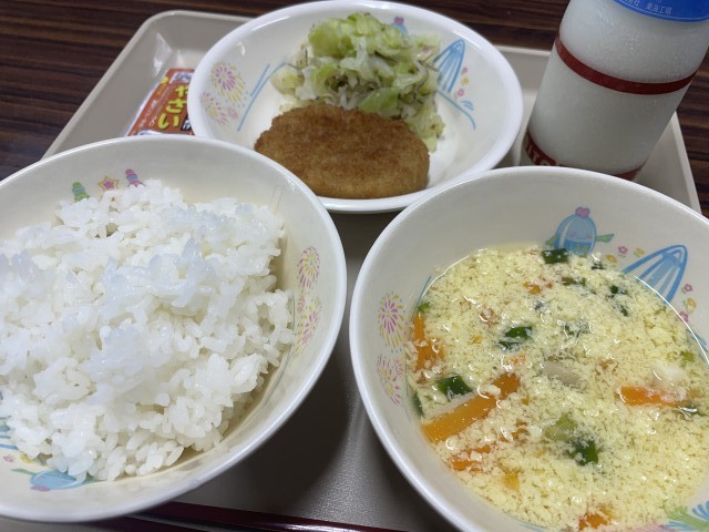 今日の給食のメニューは、ご飯、牛乳、栗コロッケ、じゃこキャベツ、かきたま汁、野菜のふりかけでした。
