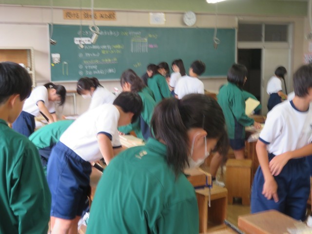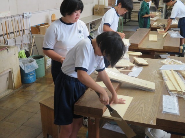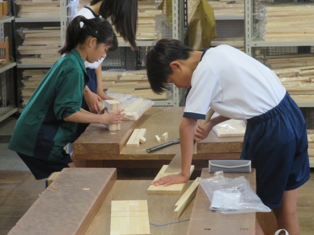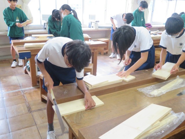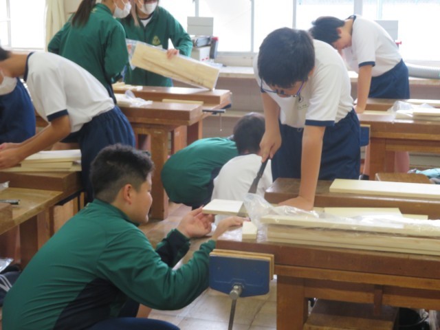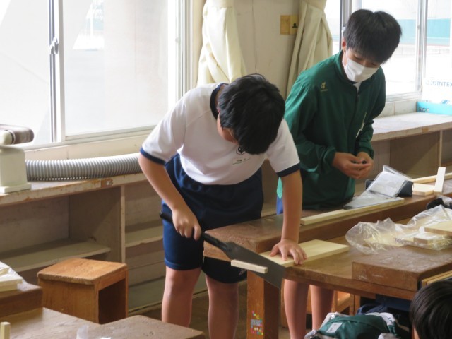 1年生の技術の授業のようすです。大きな板からのこぎりを使って部品を切り出す作業に取り組んでいました。「うまくのこぎりを引くことができましたよ」と笑顔で教えてくれました。がんばりましたね。