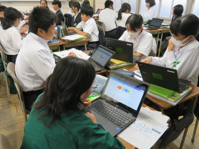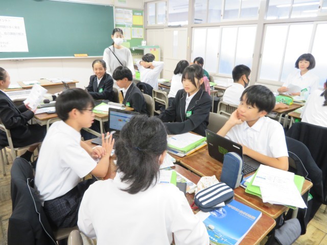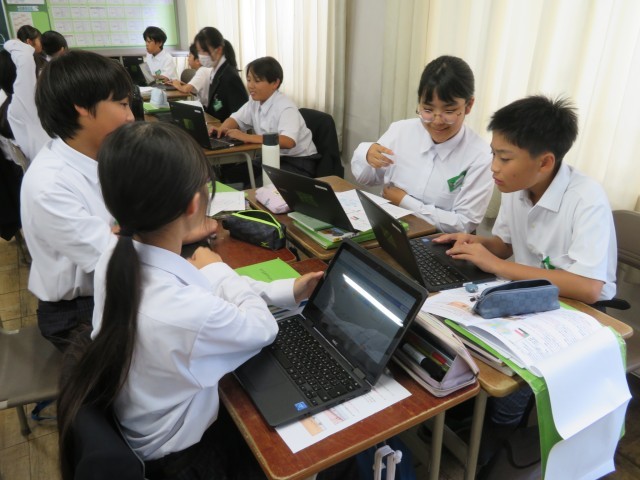 1年生の社会の授業のようすです。「スーダンの人々がよりよい生活をするために解決すべき最優先の課題について考えよう」というめあてで学習を進めていました。