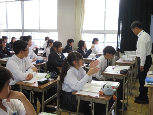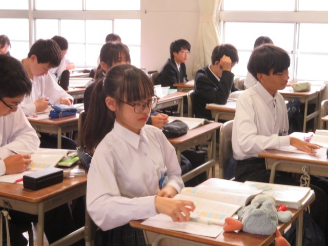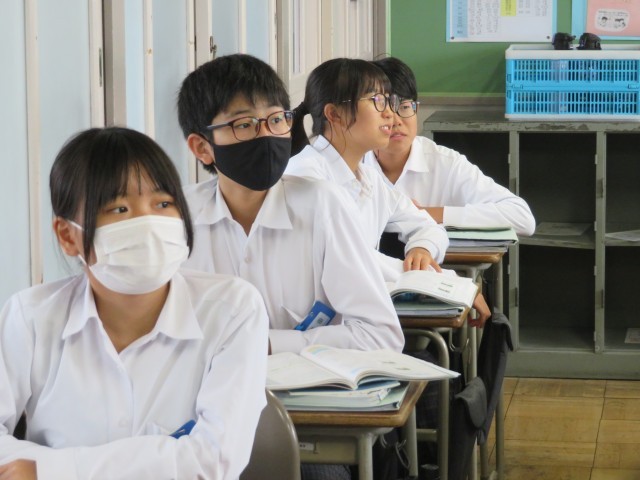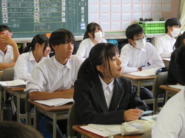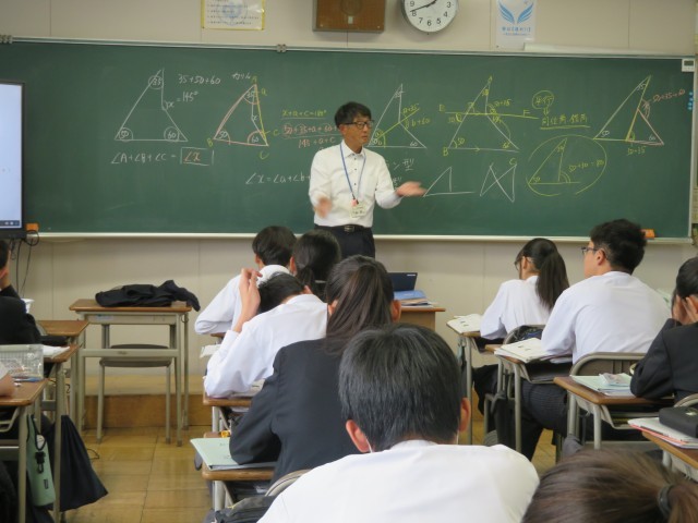 2年生の数学の授業のようすです。くぼんだ四角形のブーメラン型について、角度の求め方を考えていました。多角形の性質や平行線の角の性質などを使って、いろんな求め方があることがわかりましたね。