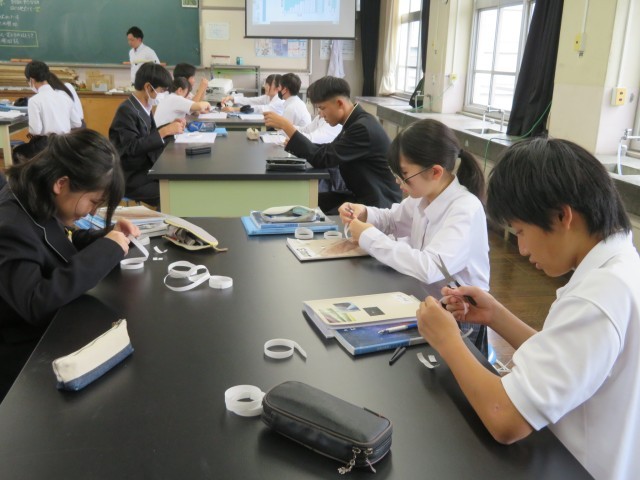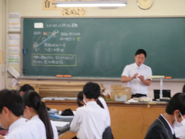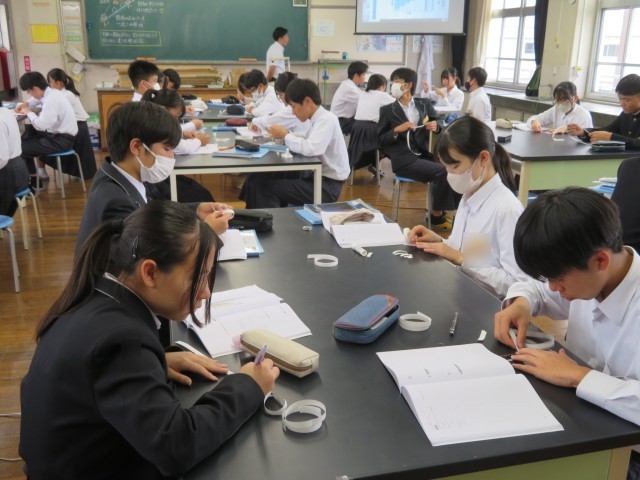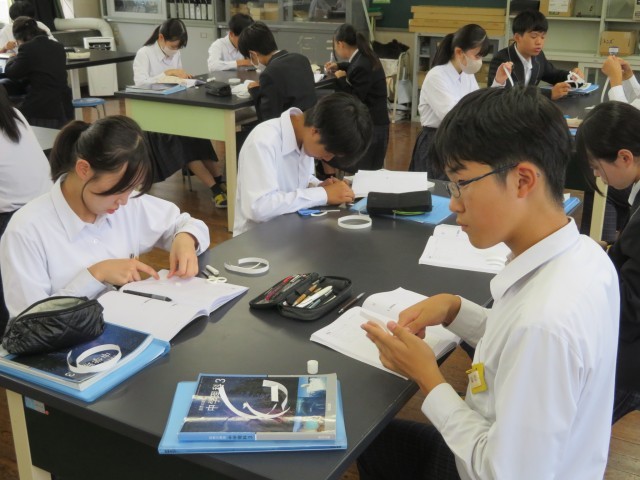 3年生の理科の授業のようすです。力がはたらき続ける運動について実験を行い、記録のテープをノートに貼ってまとめていました。物体の運動方向に一定の力がはたらき続けると、速さは増加することがわかりましたね。