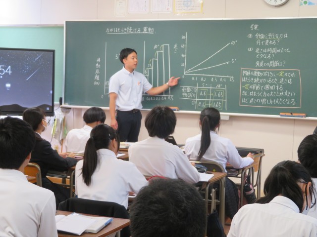 3年生の昨日の理科の授業のようすです。力がはたらき続ける運動について、物体の運動方向に一定の力がはたらき続けると、速さは増加することをまとめることができましたね。