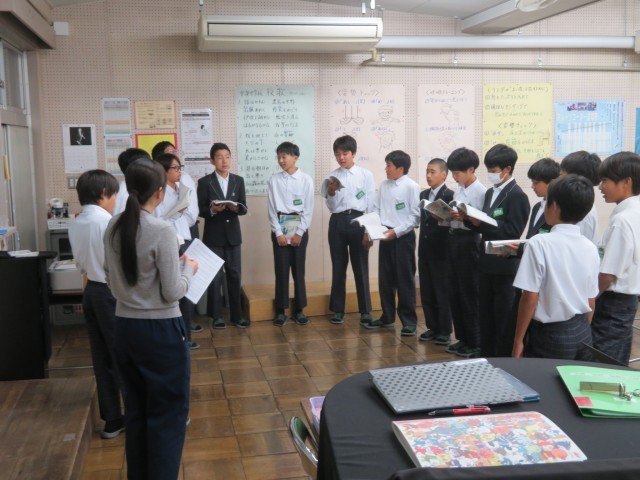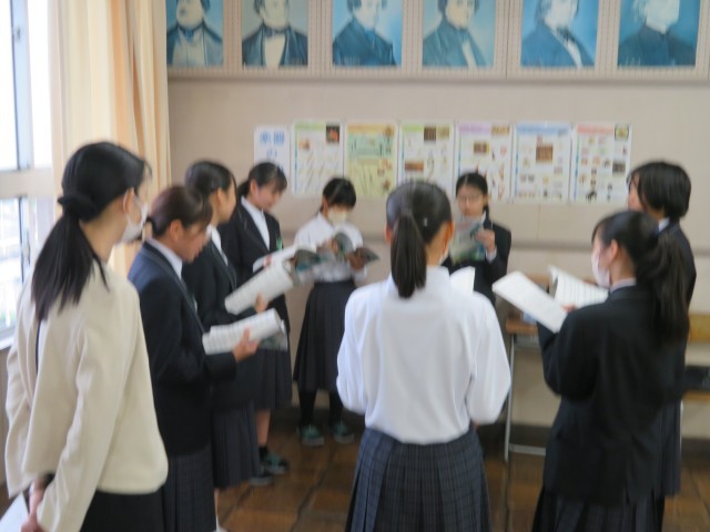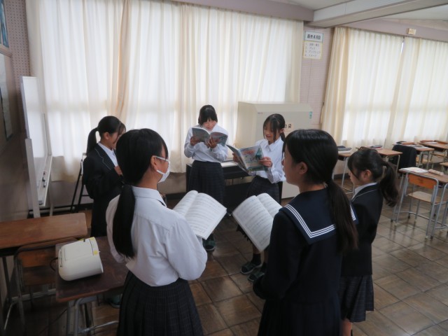 1年生の音楽の授業のようすです。クラス曲の「My Own Road」のパート練習に取り組んでいました。めあての「強弱変化を意識して歌おう」に気をつけて練習をがんばることができましたね。