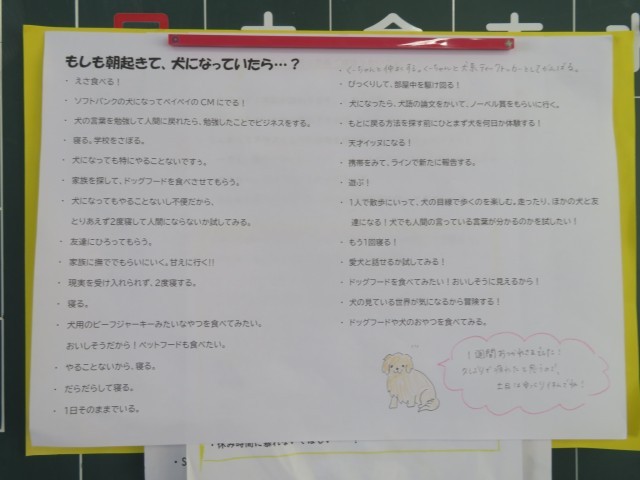 1年生の教室の掲示物を紹介します。「もしも朝起きて、犬になっていたら・・・?」というテーマで発表された意見が紹介されていました。あなたならどうします~?