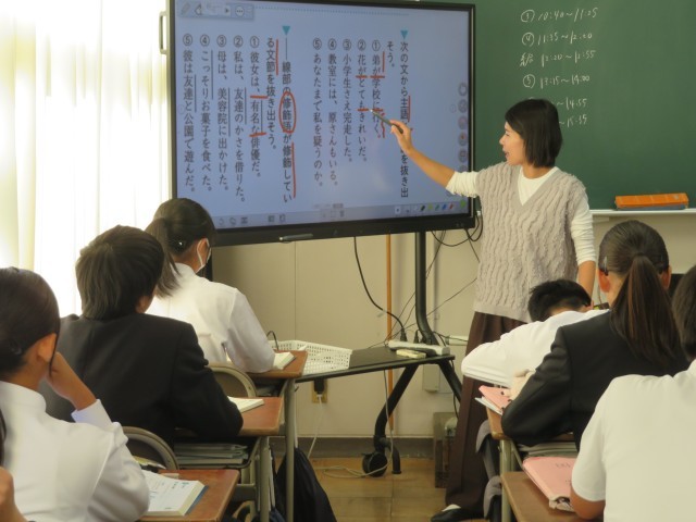 1年生の国語の授業のようすです。主語や述語、修飾語など文法について学んでいました。たくさん問題を解いて、言葉の確認をすることができましたね。