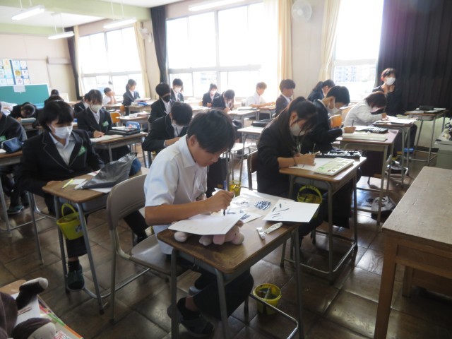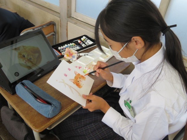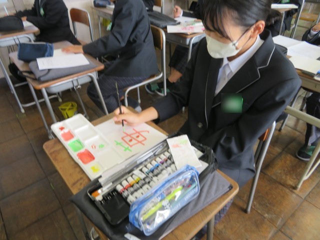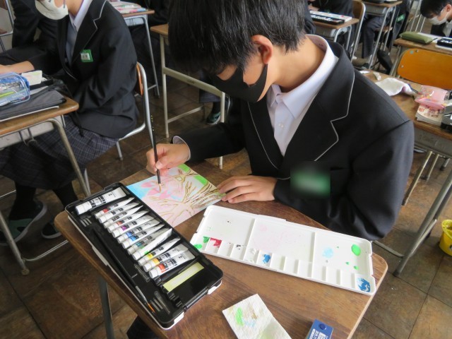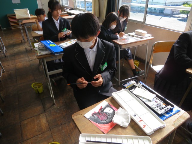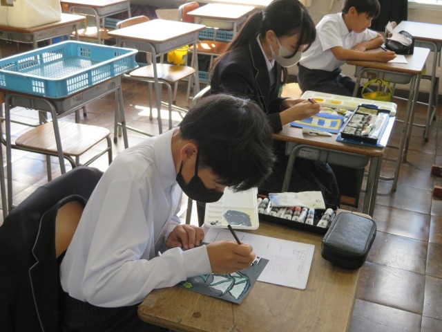 1年生の美術の授業のようすです。「色彩や形の調和を考えて着色し完成させよう」というめあてで学習を進めていました。作品が完成に近づいていましたね。1年生のすてきな作品を、ウェブ展覧会で紹介していきます。楽しみにしていてくださいね。