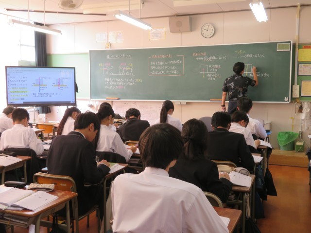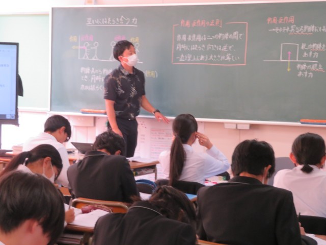 3年生の理科の授業のようすです。作用・反作用の法則について学んでいました。物体同士が力を及ぼし合うときの力の関係を示す重要な法則について、理解することができましたね。