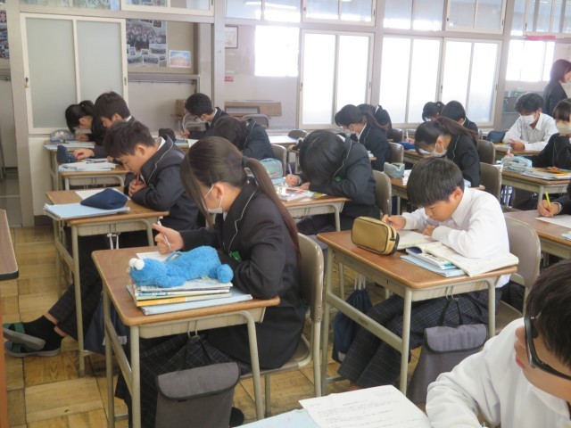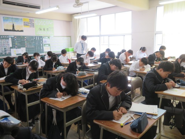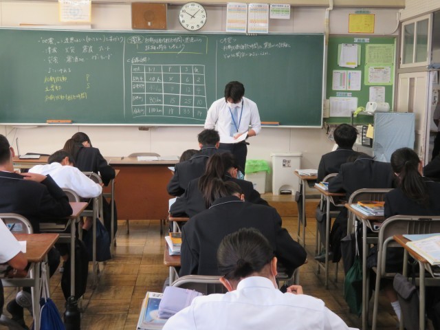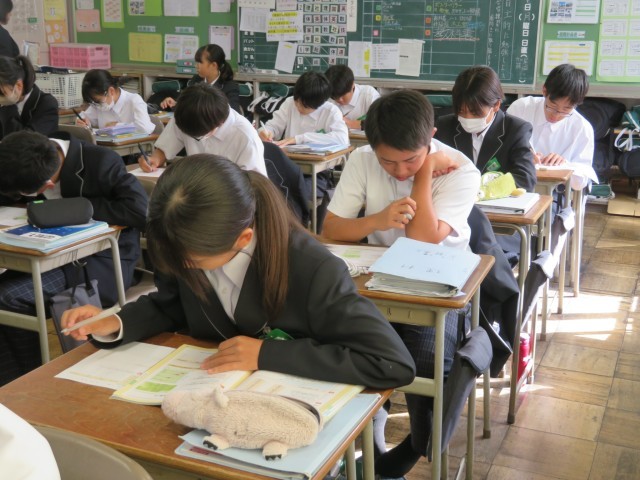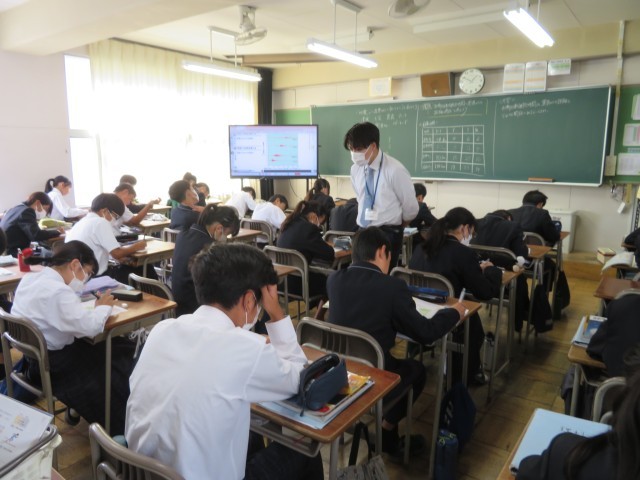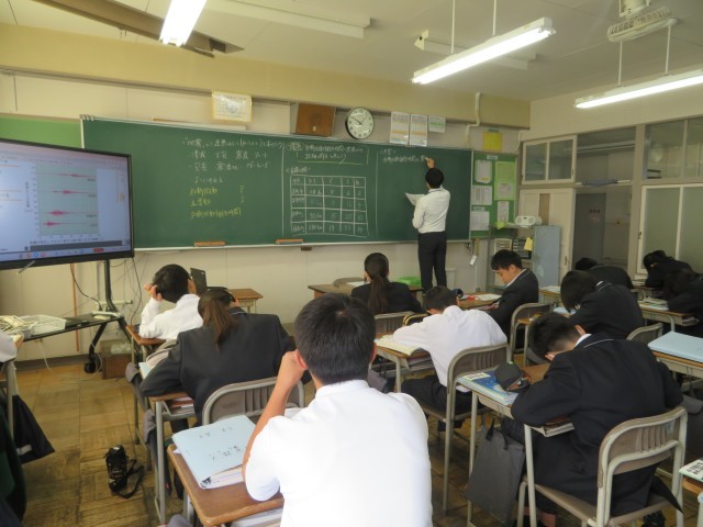 1年生の理科の授業のようすです。「初期微動継続時間と震源からの距離の関係を調べよう」というめあてで学習を進めていました。